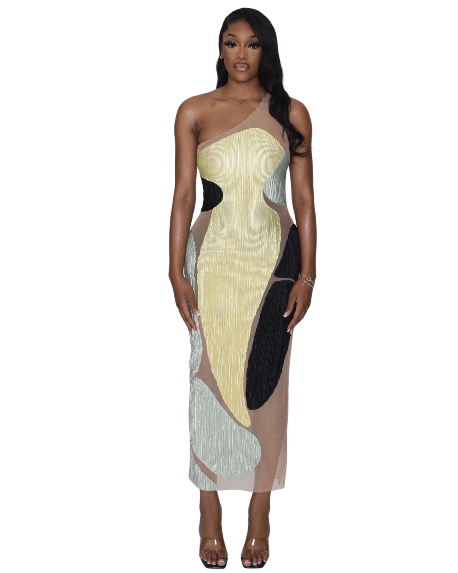 This dress has a unique colour block pattern that accentuates your figure, enhancing your curves whilst sustaining elegance.